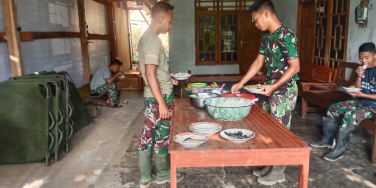 Bantul – Satgas TMMD Reguler 119 Kodim 0729 Bantul sebagai rasa syukur sarapan pagi bersama warga di Dusun Tangkil, Kal. Muntuk & Dusun Salam, Kalurahan Temuwuh, Kapanewon Dlingo, Kabupaten Bantul.