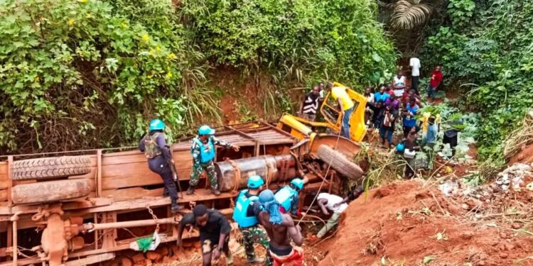 Afrika – Satgas Kizi TNI Konga XXXVII-J MINUSCA membantu evakuasi truk yang terguling kedalam jurang sedalam 8 meter yang berlokasi di jalan Pasar Besar sektor TOB Berberati, Minggu (23/06/2024).