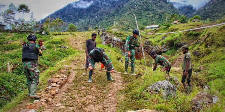 NDUGA – bedanews.com – Dalam rangka menyambut Natal dan tahun baru 2023, Pos Kotis Mbua Satgas Yonif Raider 321/GT/13/1 Kostrad bersama warga melaksanakan karya bhakti perbaikan dan pembersihan jalan bertempat di Distrik Mbua, Kabupaten Nduga, Papua.
