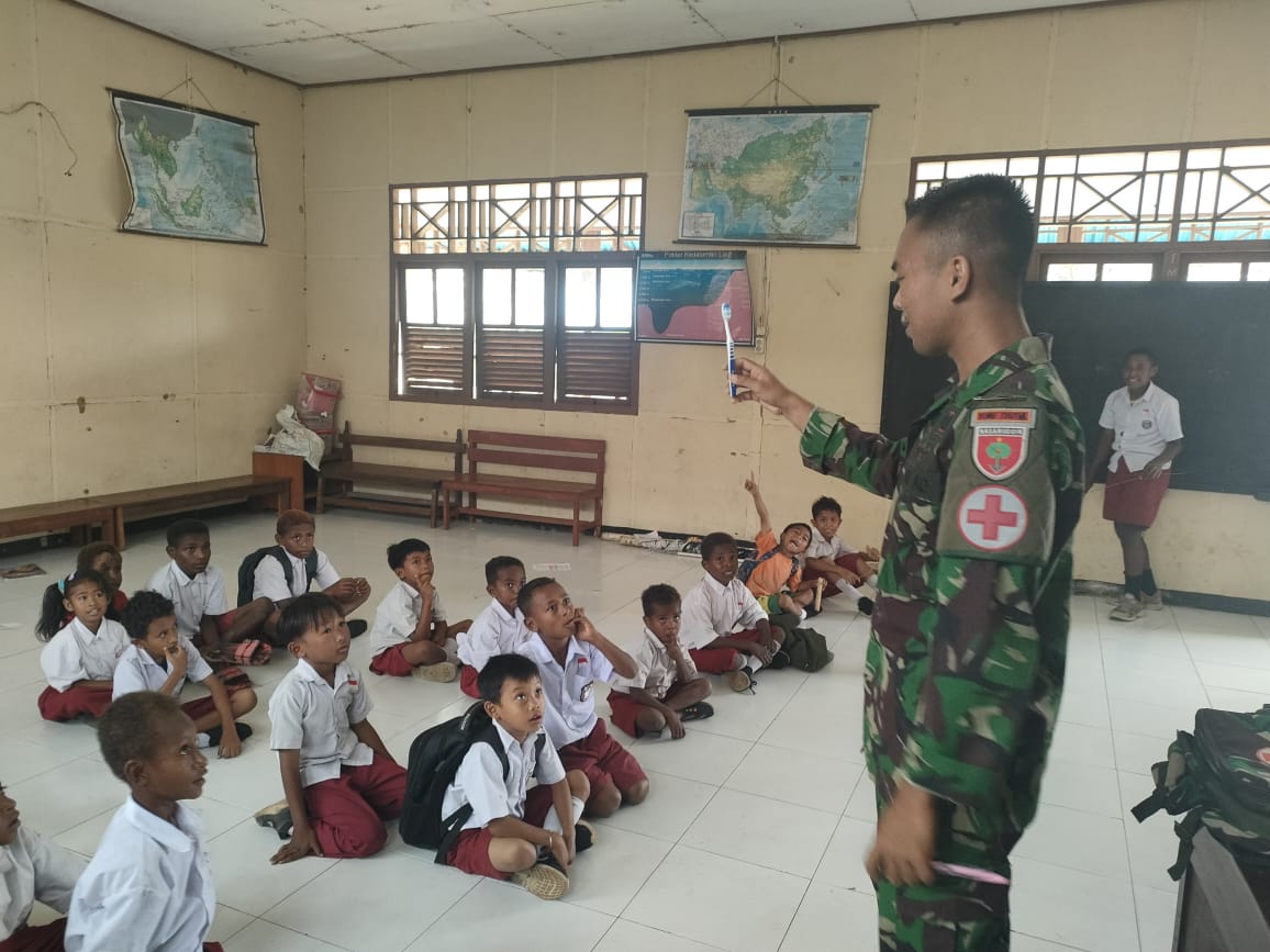 Merauke – Satuan tugas pengamanan perbatasan Yonif 726/Tml melaksanakan kegiatan edukasi tentang bagaimana cara menyikat gigi yang baik kepada anak SD YPK Kuler, Distrik Naukenjerai, Kab. Merauke, Jumat (06/09/2024).