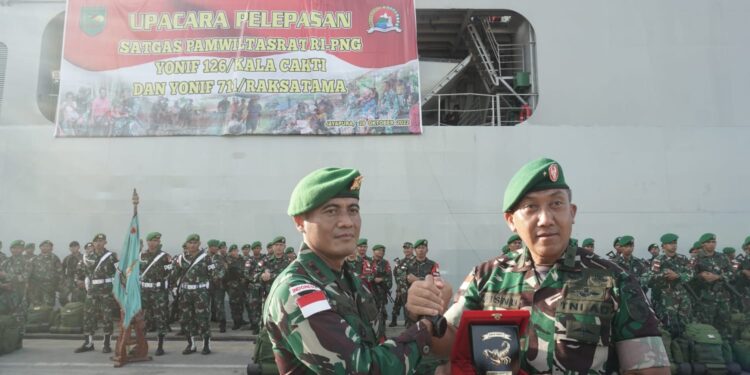 Jayapura – bedanews.com – Kasdam XVII/Cenderawasih, Brigen TNI R. Sidharta Wisnu Graha memimpin upacara pelepasan Satgas Pamtas RI-PNG Yonif 126/KC bertempat di Pelabuhan Pelindo Jayapura, Kota Jayapura, Papua, Jum’at (28/10/2022) sore.
