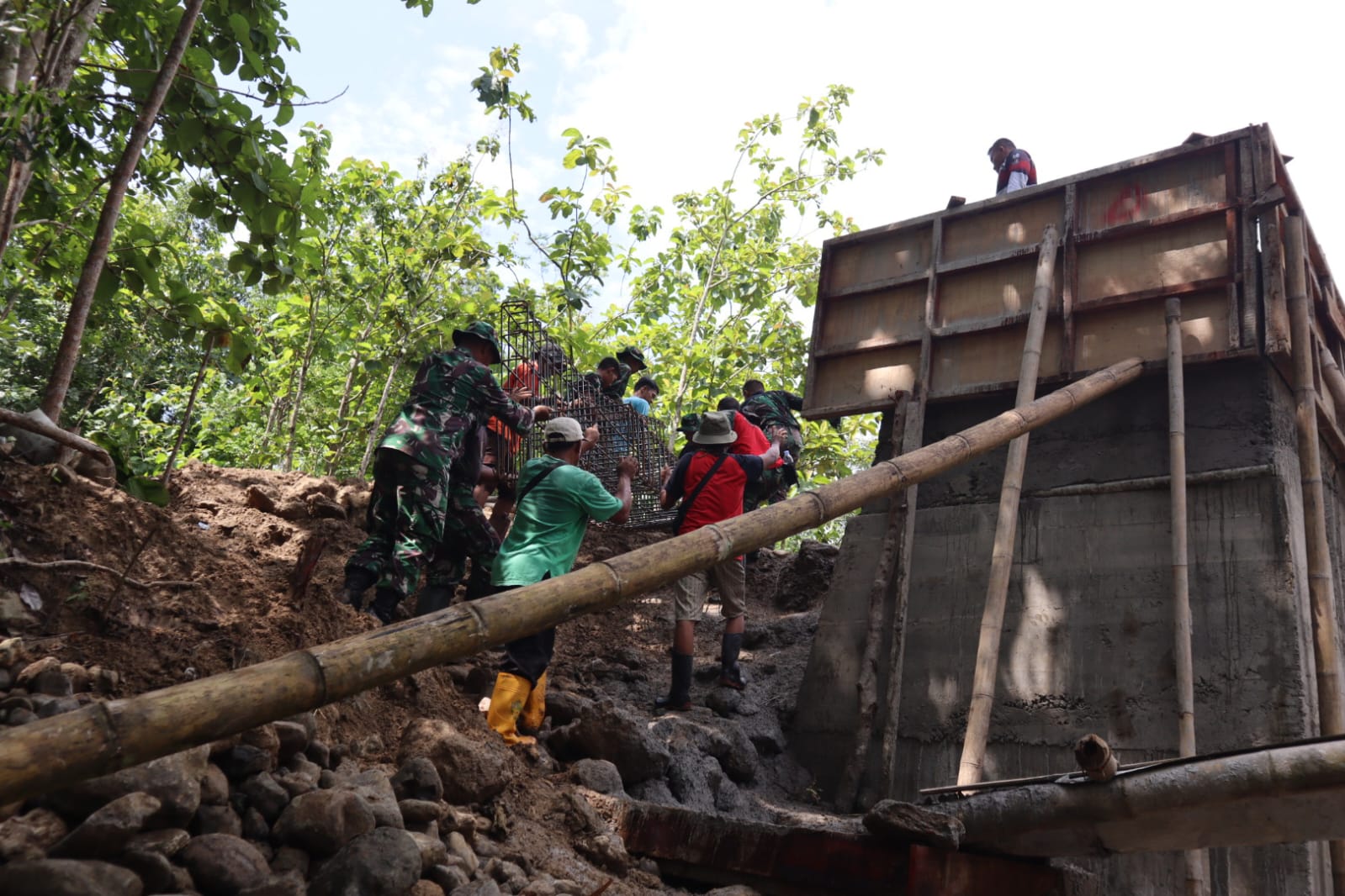 Pembangunan jembatan penghubung untuk warga Dusun Tangkil dan Dusun Salam, saat ini telah memasuki tahap pengecoran terhadap dua tiang penyangga jembatan. Terpantau dilokasi, pengecoran yang dilakukan secara gotong royong antara anggota Satgas bersama warga membuktikan antusiasme dan dukungan masyarakat setempat pada terlaksananya program TMMD.