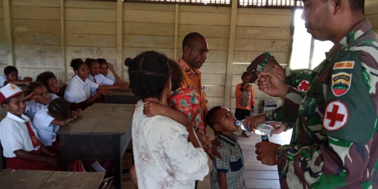 Keerom – bedanews.com – Dalam rangkaian mendukung Program Anak Indonesia Sehat, Pos Somografi Satgas Pamtas Yonif 126/KC melaksanakan pemberian syrup obat cacing dan pengecekan rutin kesehatan anak-anak usia sekolah YPPK Akarinda yang berada di Kampung Somografi, Distrik Web, Kabupaten Keerom, Papua.