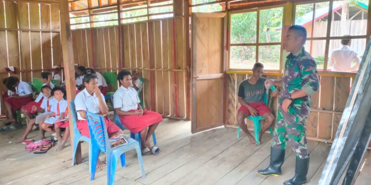 Keerom – bedanews.com – Satgas Yonif 126/KC Pos Tatakra mengajarkan pendidikan karakter kepada anak-anak SD Inpres Fafinimbo di Kampung Tatakra, Distrik Web, Papua.