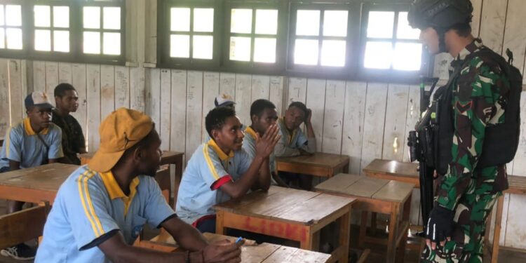Pegunungan Bintang – bedanews.com – Peduli terhadap pendidikan, Satgas Yonif 143/TWEJ Pos Okbibab mengunjungi siswa guna memberikan materi wawasan kebangsaan di SMPN Okbibab, Distrik Okbibab, Kab. Pegunungan Bintang, Papua, Senin (06/03/2023).