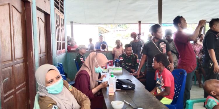 Keerom – Dengan menggandeng dinas kesehatan Kabupaten Keerom, Satgas Yonif 143/TWEJ Pos Yabanda menggelar pengobatan masal secara gratis di Kampng Yabanda, Distrik Yaffi Kab. Keerom, Papua, Selasa (30/05/2023).