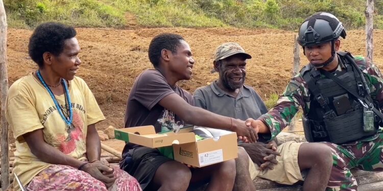 Lanny Jaya, bedanews.com — Satgas Yonif Mekanis 203/AK Pos Malagayneri memberikan seragam sekolah dan sepatu baru salah satu anak di Desa Gumban Hidup, Distrik Malagayneri, Kabupaten Lanny Jaya, Papua, Sabtu (07/01/2023). Hal tersebut disampaikan oleh Danpos Malagayneri Letda Inf Sukamto dalam keterangannya di Distrik Malagayneri.