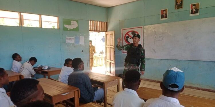 Lanny Jaya, bedanews.com — Personel Satgas Yonif Mekanis 203/AK Pos Makki hadir di SMAN 2 Makki guna memberikan penyuluhan wawasan kebangsaan dan memberikan semangat maupun motivasi belajar serta memberikan sosialisasi rekrutmen TNI untuk murid-murid SMAN 2 Makki, Distrik Makki, Kabuputen Lanny Jaya, Rabu (8/3/2023).