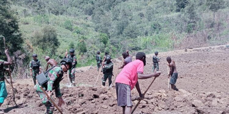Lanny Jaya, bedanews.com | Satgas Yonif Mekanis 203/AK yang melaksanakan kegiatan penugasan di wilayah Papua membantu meningkatkan perekonomian masyarakat dengan membuka lahan untuk berkebun di Kampung Popome, Distrik Mukoni, Kabupaten Lanny Jaya, Selasa (22/11/2022).