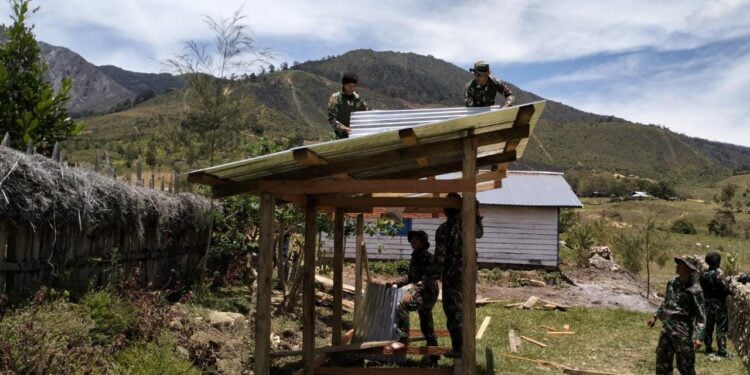 Personel Satgas Pos Malagayneri di bawah pimpinan Wadanpos Malagayneri, Letda Inf Siskamak bersama 15 anggotanya melaksanakan kegiatan perehaban Gereja Gumban Hidup di Distrik Malagayneri, Kamis (08/09/2022).