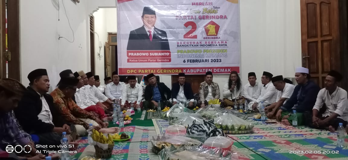 Demak – bedanews.com – Dalam Rangka Memperingati Harlah Partai Gerindra ke-15 dan 1 Abad NU, DPC Partai Gerindra Kab. Demak menyelenggarakan Sholat Maghrib Berjamaah, Mujahadah dan Maulidul Rosul, bertempat di Sekretariat Kantor DPC, Jln Lingkar Jogoloyo, Demak, Minggu (5/2).