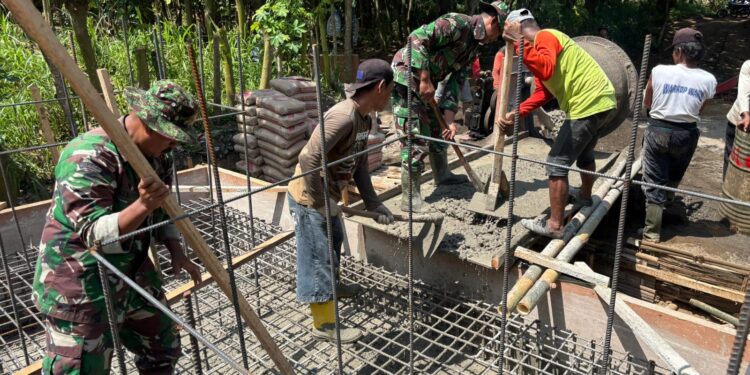TULUNGAGUNG || Bedanews.com – Semangat kebersamaan dan kepedulian terhadap pembangunan desa kembali terlihat dalam proses pembangunan Jembatan Perintis Garuda di Desa Kauman, Kecamatan Kauman, Kabupaten Tulungagung. Warga bersama anggota TNI dari Koramil Tipe B 0807/13/Kauman bahu-membahu melaksanakan pengecoran pondasi jembatan, sebagai tahap penting dalam pembangunan infrastruktur tersebut, Senin (20/04/2026).
