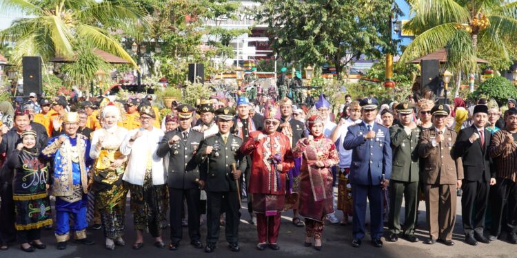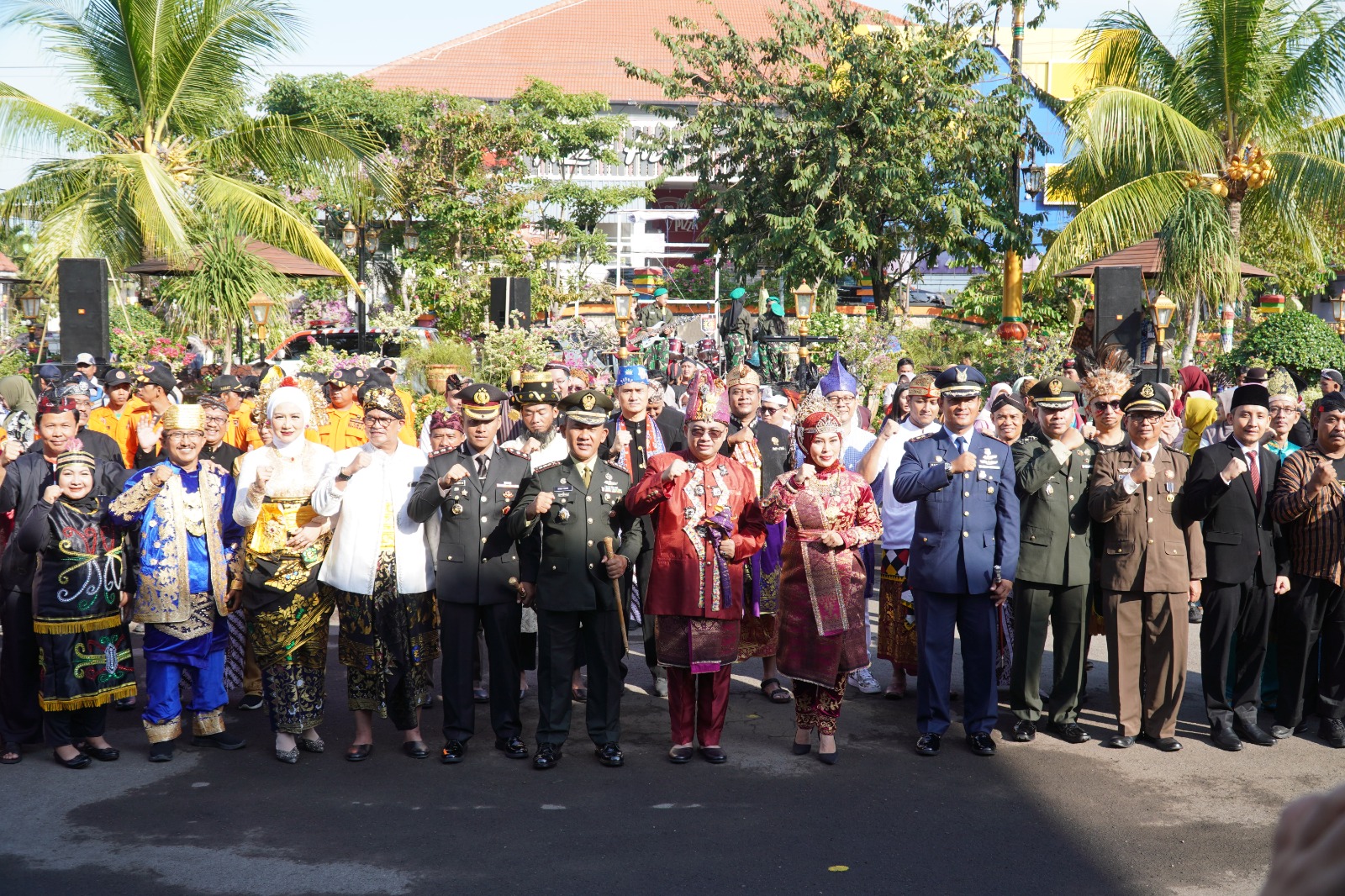 MADIUN || bedanews.com – Peringatan Hari Lahir Pancasila yang diselenggarakan di Balai Kota Madiun tampak begitu meriah, Sabtu (1/6/2024). Para peserta dan tamu undangan tampak menggunakan pakaian adat dari berbagai daerah yang menggambarkan keberagaman budaya bangsa Indonesia.