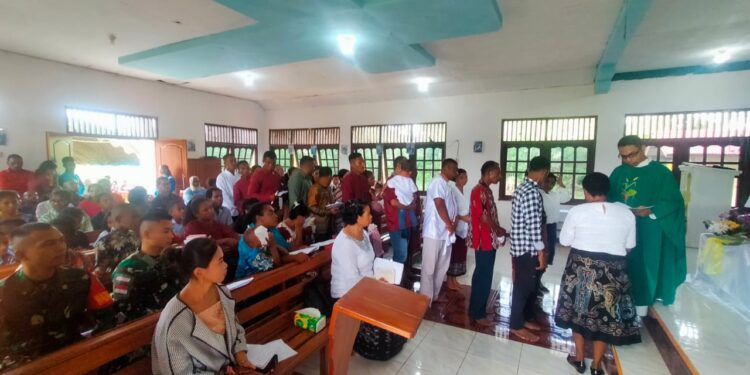 Merauke – Memiliki kepatuhan dan senantiasa mengingat Tuhan dimanapun berada dan bertugas, Satgas Pamtas Yonif 726/Tml melaksanakan ibadah dan mengikuti acara pembaptisan di Gereja Katolik Santa Bernadetha Kampung Sipias, Distrik Eligobel Kab. Merauke, Selasa (11/06/2024)