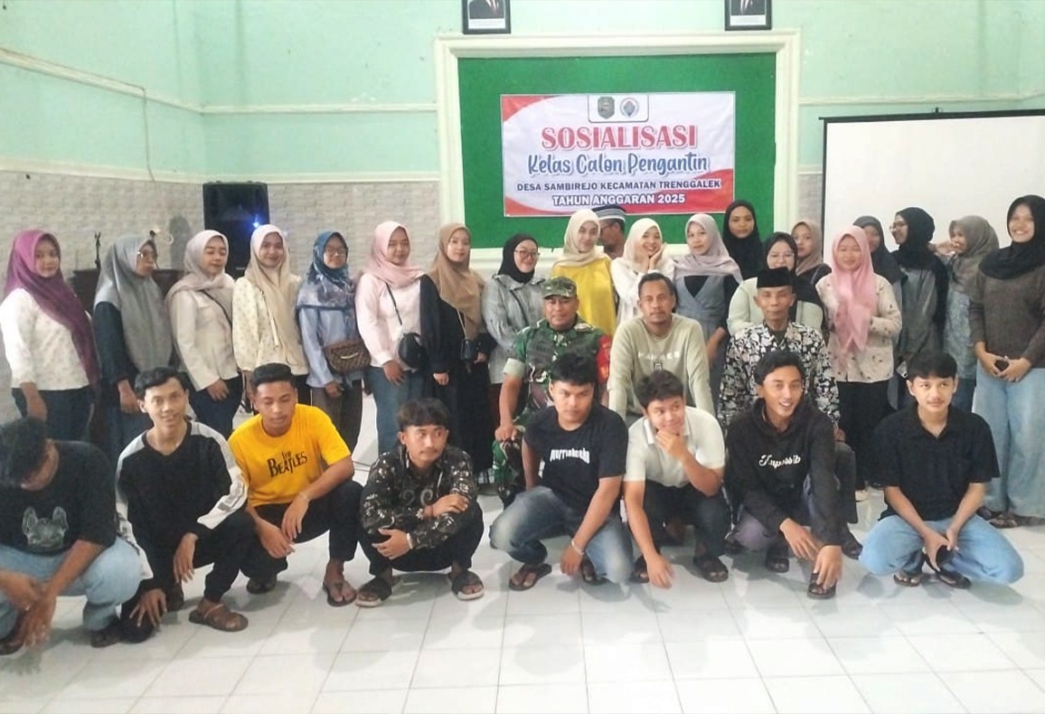 TRENGGALEK || Bedanews.com – Upaya mewujudkan kesejahteraan dan kemajuan masyarakat desa terus digalakkan melalui sinergi antara TNI-Polri dan pemerintah daerah. Salah satu bentuk konkret kolaborasi itu terlihat dalam kegiatan Sosialisasi Kelas Calon Pengantin (Catin) yang digelar di Balai Desa Sambirejo, Kecamatan Trenggalek, Kabupaten Trenggalek, Kamis (13/11/2025).