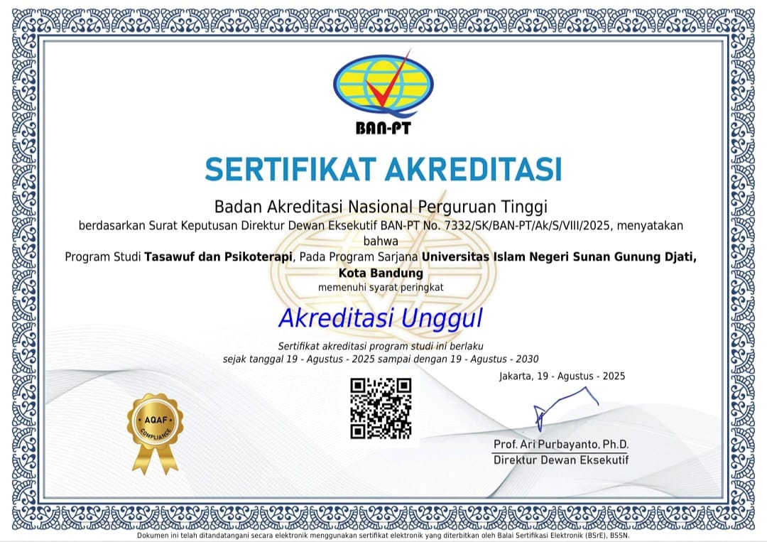 Program Studi Tasawuf Psikoterapi (TP) Fakultas Ushuluddin (FU) UIN Sunan Gunung Djati Bandung berhasil meraih Akreditasi Unggul dari Badan Akreditasi Nasional Perguruan Tinggi (BAN-PT). Penghargaan ini merupakan hasil dari kerja keras dan sinergitas yang dibangun oleh Ketua Prodi TP.Dr. Cucu Setiawan, dan Sekretaris Prodi, Dr. Dian Siti Nurjanah, bersama tim borang dan civitas fakultas, serta elemen lainnya.