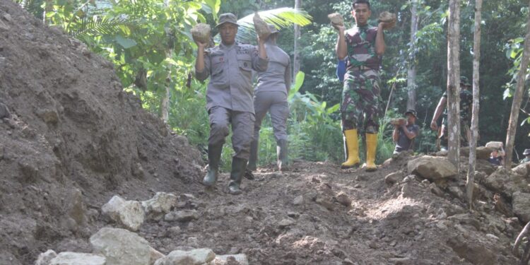 Tampak personel dari Brimob Polda DIY bersama Satgas TMMD Reguler Ke-119 Kodim 0729 bersama bekerja dan bergotong-royong. Sinergitas dan soliditas TNI – Polri dan masyarakat ternyata bukan sebagai slogan semata, hal ini diwujudkan oleh sejumlah prajurit TNI dan anggota Polri serta masyarakat yang tergabung dalam Satuan Tugas (Satgas) TNI Manunggal Membangun Desa (TMMD) Reguler Ke-119 Kodim 0729 Bantul.
