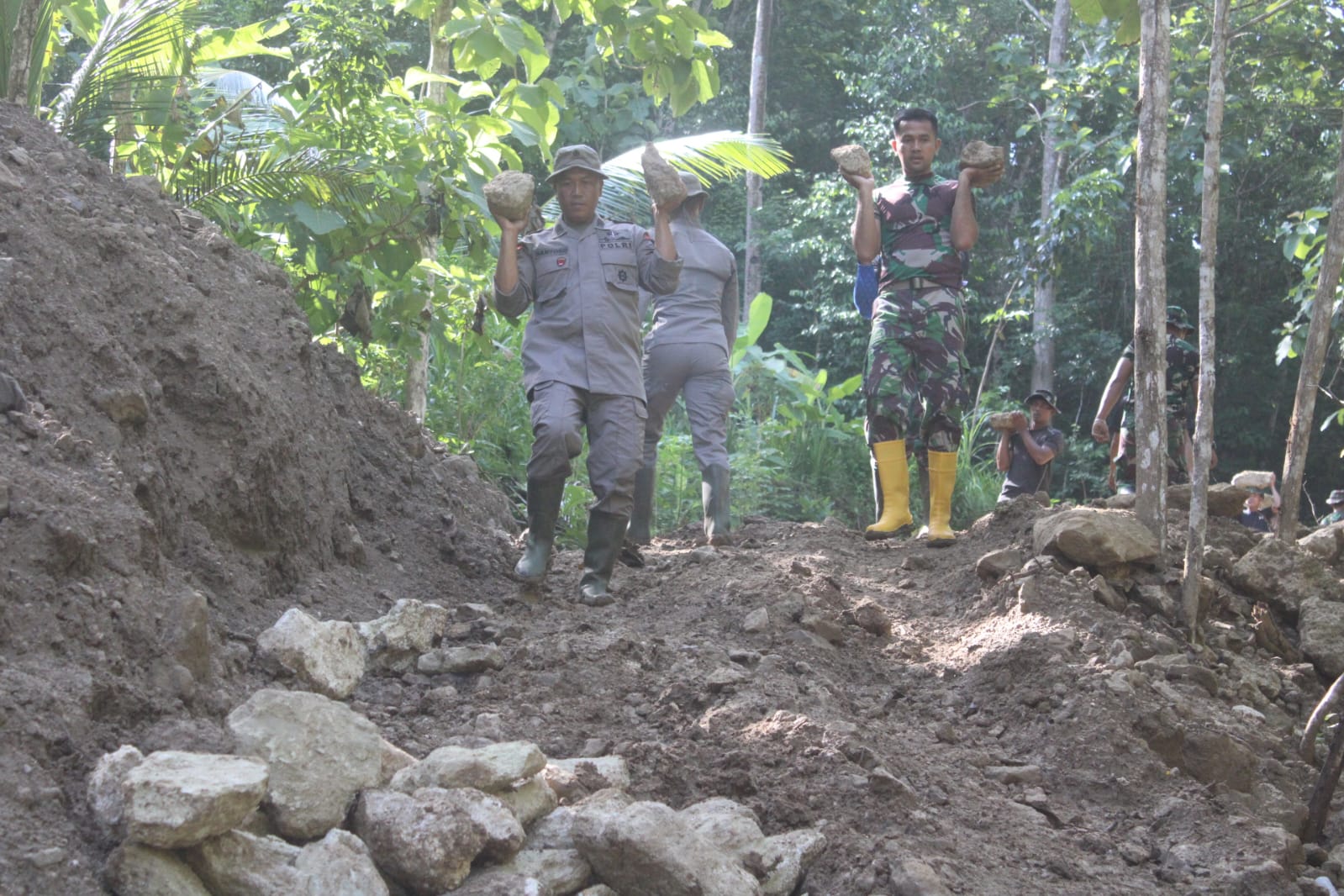 Tampak personel dari Brimob Polda DIY bersama Satgas TMMD Reguler Ke-119 Kodim 0729 bersama bekerja dan bergotong-royong. Sinergitas dan soliditas TNI – Polri dan masyarakat ternyata bukan sebagai slogan semata, hal ini diwujudkan oleh sejumlah prajurit TNI dan anggota Polri serta masyarakat yang tergabung dalam Satuan Tugas (Satgas) TNI Manunggal Membangun Desa (TMMD) Reguler Ke-119 Kodim 0729 Bantul.