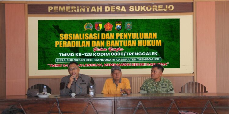 TRENGGALEK || Bedanews.com – Satuan Tugas (Satgas) TNI Manunggal Membangun Desa (TMMD) ke-128 Kodim 0806/Trenggalek terus memperkuat sinergi lintas instansi dalam menggugah masyarakat agar melek hukum. Kali ini, Satgas TMMD menggandeng Kejaksaan Negeri (Kejari) Trenggalek untuk menggelar Sosialisasi Peradilan dan Bantuan Hukum.