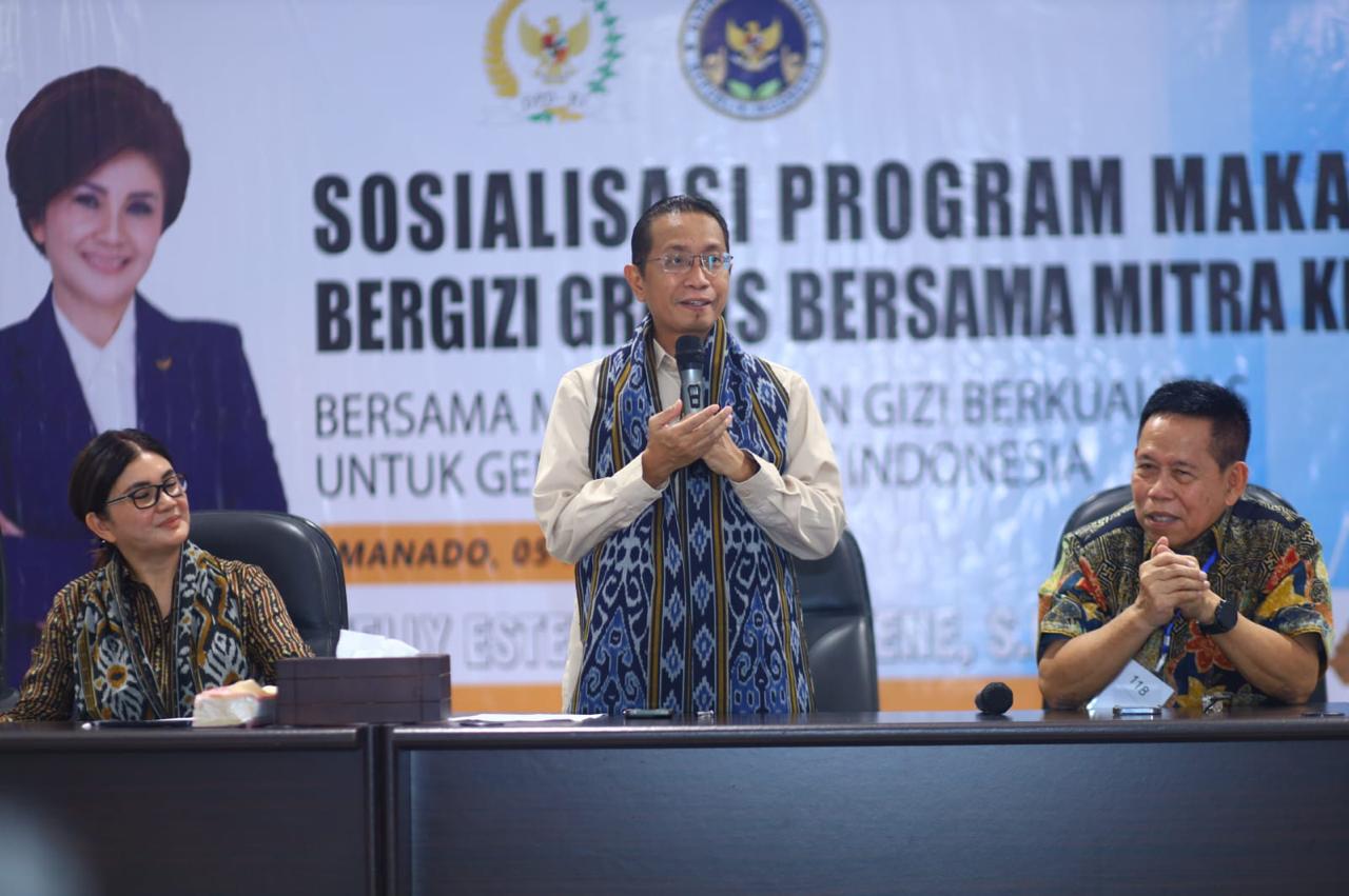 MANADO – Bedanews.com – Sosialisasi Program Makan Bergizi Gratis (MBG) bersama mitra kerja digelar di Kantor DPW NasDem Sulawesi Utara, Paniki Bawah, Mapanget, Kota Manado, Kamis (5/3). Kegiatan ini dihadiri oleh Ketua Komisi IX DPR RI Felly Estelita Runtuwene, Direktur Pendidikan Brandes Lasut, serta Tenaga Ahli Direktorat Badan Gizi Nasional (BGN) Imam Bachtiar Farianto.