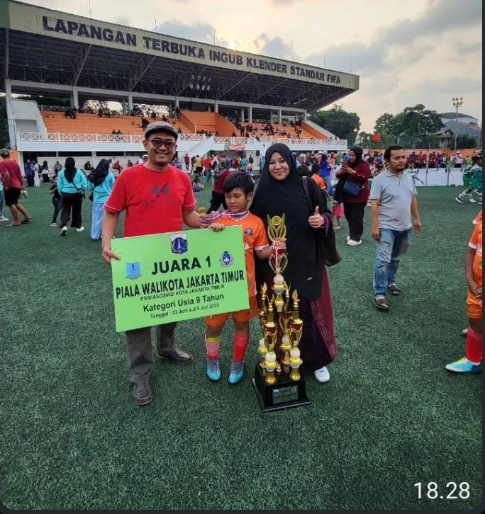 SUPORT-Pesepak Bola Khalif Reynand Muttaqin yang Santri aktif di Pondok Pesantren Qurrota A’yun, Condet, mendapat Suport bersama Kedua orang tua. (Foto Ist).