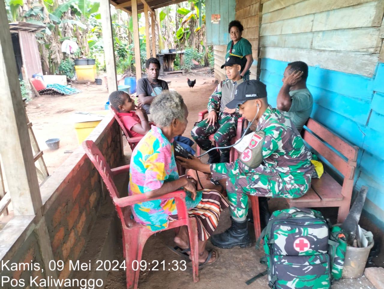 Merauke – Bertempat di Kampung Erambu, Distrik Sota, Kab. Merauke, Personel Satgas Pamtas Yonif 726/Tml terus melaksanakan kegiatan pelayanan kesehatan door to door di Kampung Erambu, Minggu (12/05/2024).