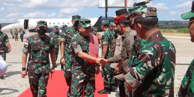 Jakarta – bedanews.com – Kepala Staf Angkatan Darat (Kasad), Jenderal TNI Dudung Abdurchman, S.E., M.M disambut tarian Taebenu saat tiba di Bandara El Tari Kupang dalam rangkaian kunjungan kerja di wilayah Kodam IX/Udayana – NTT, Rabu (18/5/2022).