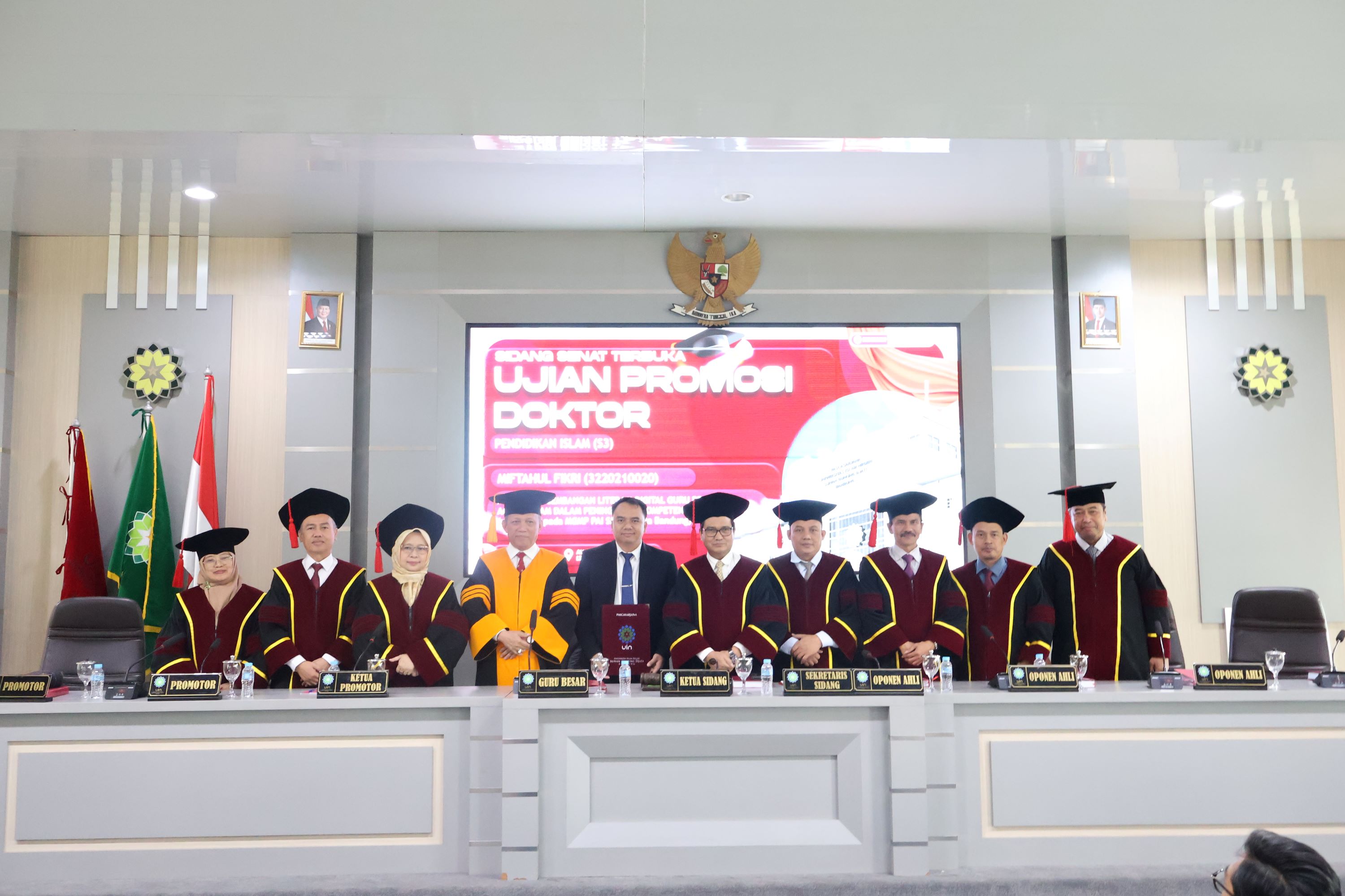 Sidang terbuka program doktoral dihadiri Dekan Fakultas Tarbiyah dan Keguruan, Fakry Hamdani, Ph.D · Wakil Dekan II · Dr. Hariman Surya Siregar, M.Ag, kerabat, teman dekat dan tamu undangan lainnya.