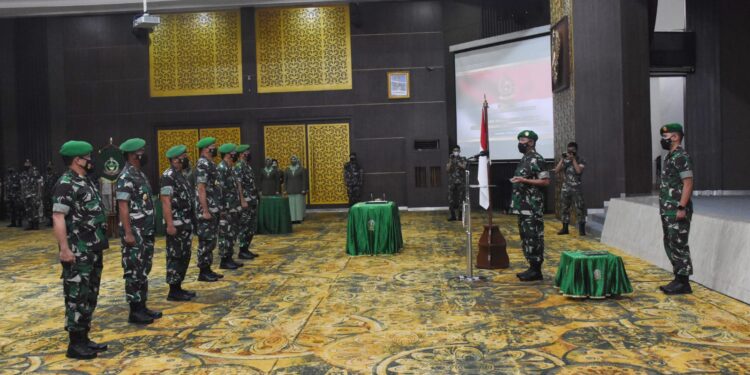 Bandung – bedanews.com – Bertempat di Gedung Prof Dr. Satrio Seskoad, Komandan Seskoad, Mayjen TNI Dr. Anton Nugroho, MMDS., M.A memimpin serah terima jabatan Dirlem Seskoad dari Brigjen TNI Eddy S. Siahaan, S.I.P., M.M kepada Brigjen TNI Johanis Payung, S.E., M.Tr (Han), Dirjianbang Seskoad dari Brigjen TNI Dwi Endrosasongko, S.Sos kepada Brigjen TNI Achmad Fauzi, S.I.P., M.M dan Kakordos Seskoad dari Brigjen TNI Ito Hediarto, S.Sos., M.Sc kepada Brigjen TNI Dr. Rachmad S, S.I.P., M.M., M.Tr (Han), Selasa (8/2/2022).