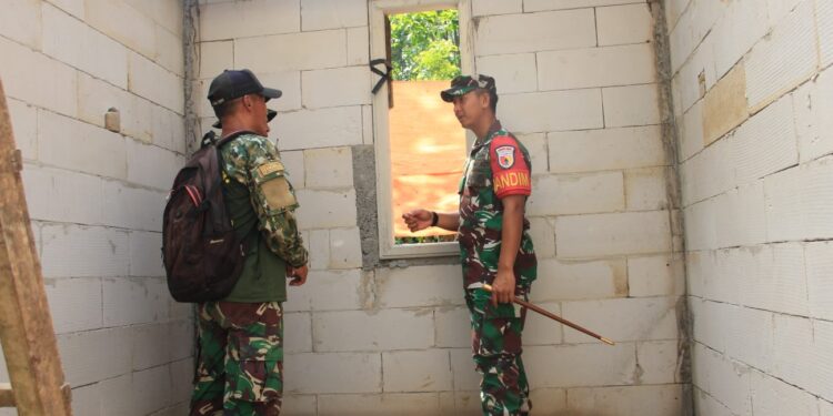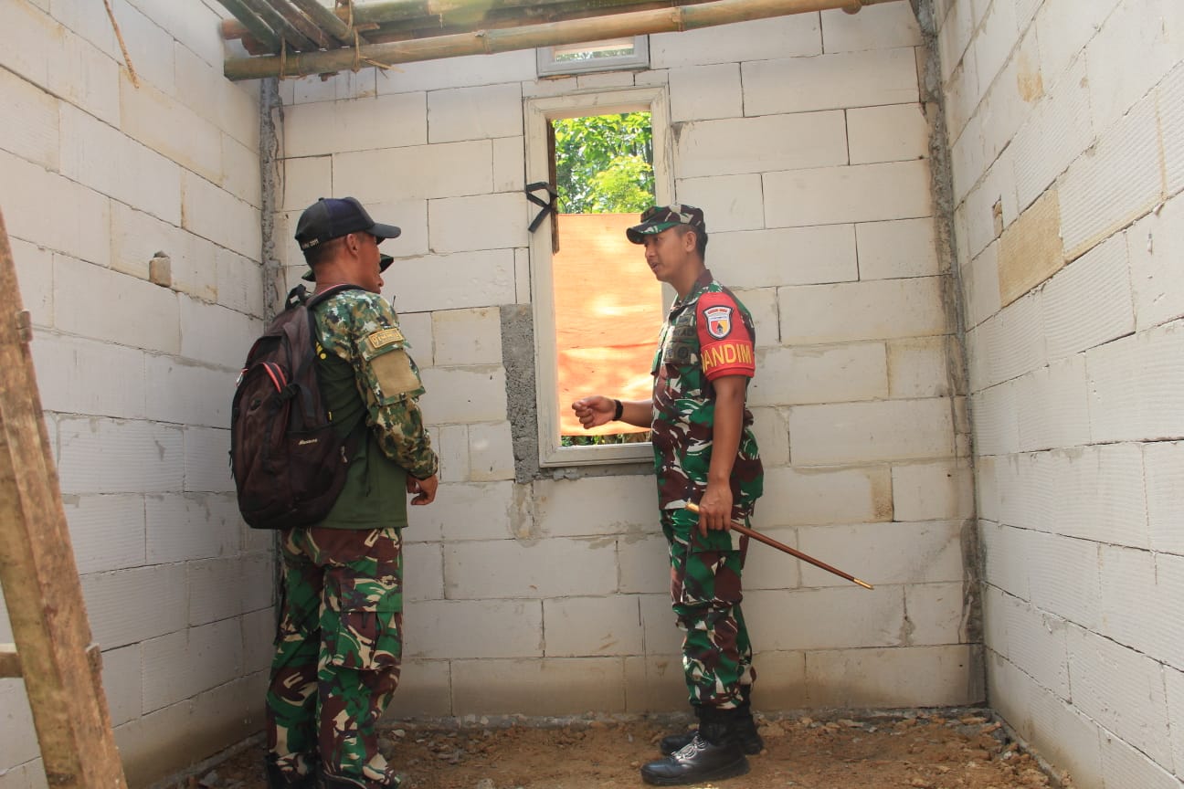 Kehadirannya pria dengan dua melati di pundak ini untuk meninjau progress rehab rumah tidak layak huni (RTLH). “Sudah mulai kelihatan bagus. Sudah hamper 70 persen ini,” tanya Dansatgas pada anggotanya yang sedang memplester dindidng rumah.