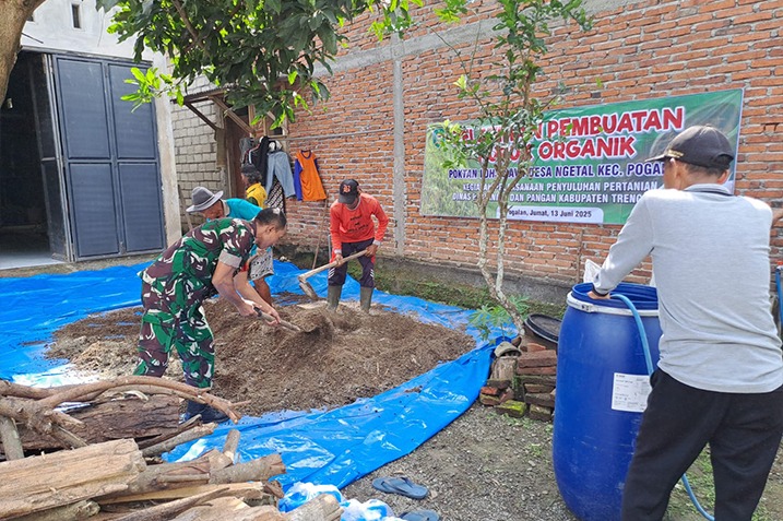 TRENGGALEK || Bedanews.com – Upaya mendorong kemandirian petani dan pertanian ramah lingkungan terus dilakukan oleh TNI melalui peran aktif Babinsa di lapangan. Seperti yang dilakukan Babinsa Ngetal, Kecamatan Pogalan, Serda Agus Eriendi, anggota Koramil 0806-02/Pogalan. Ia bersinergi dengan Bhabinkamtibmas Aipda Sandi dan Dinas Pertanian dan Pangan Kabupaten Trenggalek dalam menggelar pelatihan pembuatan pupuk organik bagi Kelompok Tani (Poktan) Loh Jinawi, Jum’at (13/6/2025).