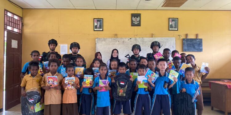 Merauke – Demi meningkatkan daya tarik generasi muda di perbatasan RI-PNG untuk mau sekolah, Satgas Pamtas Yonif 726/Tml melakukan pembagian tas sekolah dan alat tulis secara gratis kepada anak-anak sekolah di SD Inpres Bupul 13, Kp.Kirely, Distrik Ulilin, Kab. Merauke, Senin (06/05/2024).