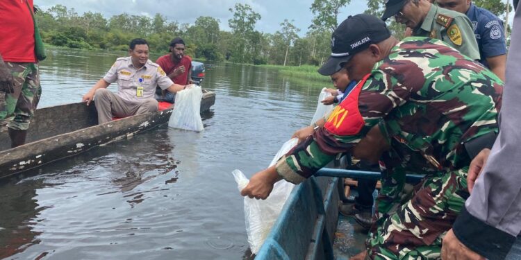 Merauke – Demi menjaga dan turut melestarikan satwa endemik Papua, Satgas Pamtas Yonif 726/Tml ikut serta dalam kegiatan restocing atau melepas kembali bibit ikan arwana irian sebanyak 434 ekor, Selasa (14/05/2024).