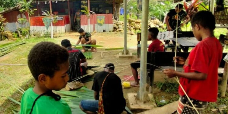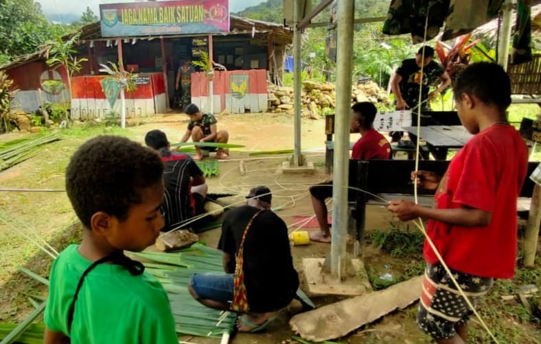 “Awalnya personel kami berkomunikasi menemui bapak Yulianus Ball Wakil Ketua Adat Kampung Tatakra selaku pemilik ulayat minta. Kemudian baliau memberi daun sagu yang berguna untuk pembuatan atap Pos karena sudah rusak,” ungkap Danpos.