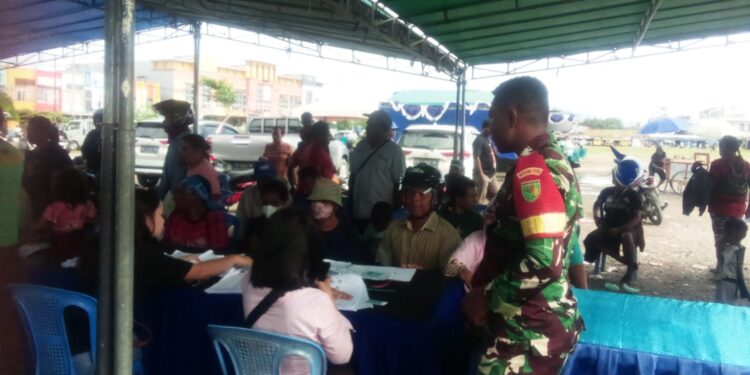 Timika, bedanews.com – Babinsa Koramil 02/Timika Kodim 1710/Mimika Koptu Irayan Faref dan Pratu Petrus menghadiri sekaligus lakukan pendampingan dan pengamanan kegiatan penyaluran Bantuan Langsung Tunai (BLT) Dana Desa oleh Kantor Pos dan Dinas Sosial, bertempat di Pasar Lama, Distrik Mimika Baru, Kab. Mimika, Sabtu (17/2/2024).